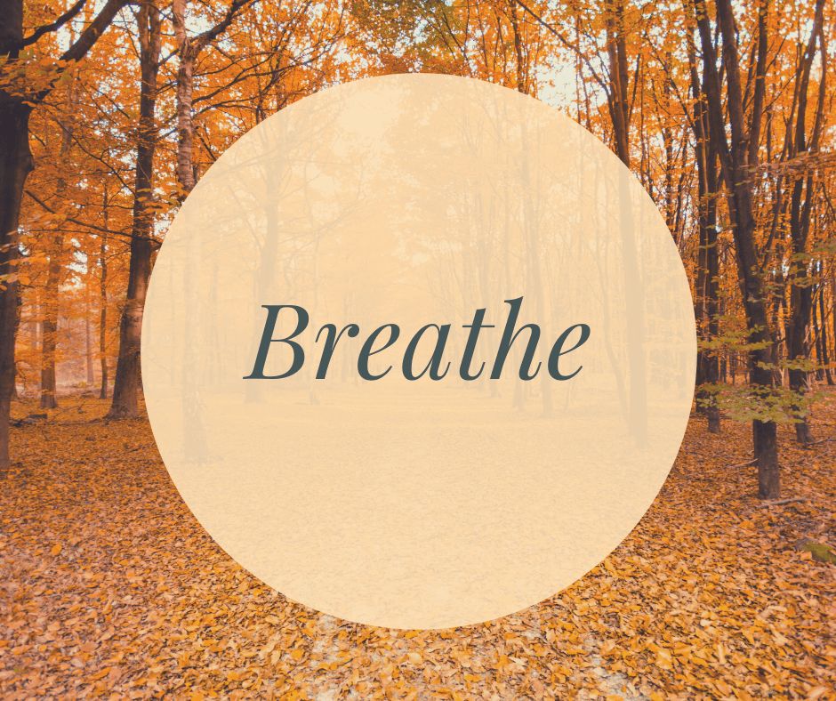 A light orange circle is set inside a picture of trees covered in orange leaves. The text inside the circle reads “breathe.”